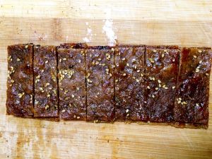 烤好的肉铺晾凉、定型,将周围边角切掉。