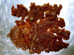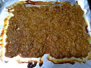 烘烤到时后,取出肉铺,根据肉饼厚度,查看脱水程度,确定是否需要翻面再次烘烤。(烘烤出水属正常情况,将水倒出后继续)