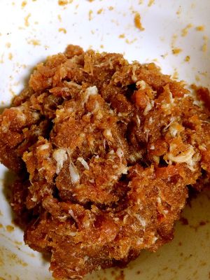 将1勺黑胡椒粉,2勺蜂蜜,2勺白糖,1勺盐,2勺生抽,2勺料酒,1勺鸡汁依次放入肉馅中,向同一方向搅拌至上浆。