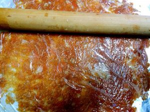 肉馅上覆盖保鲜膜,用擀面棍擀薄,大小不要超过锡纸。