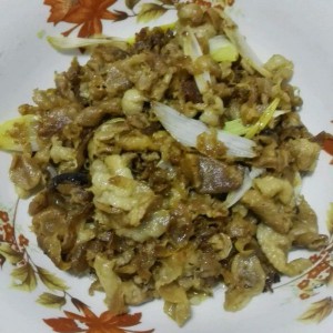 放入羊肉炒,颜色变熟之后放入大葱继续翻炒,继而放入少许料酒和醋,盐,大葱炒软之后即可出锅装盘