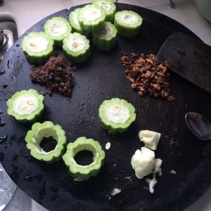将木耳、香菇,切小块,尽量剁碎一点。将苦瓜切成环形。