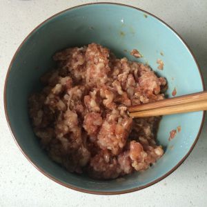 将适量的:生抽、玉米淀粉、白糖、盐 放到肉末里,再把剁碎的木耳、香菇 放入肉末里,一起搅拌好,腌制5—10分钟。