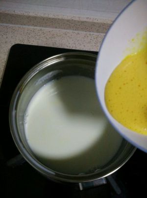 锅中的蛋奶混合物加入容器 加入淡奶油 上下搅拌