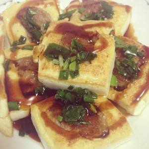 油锅烧热后转小火,放入豆腐,最好先将肉面朝下。每面小火煎两三分钟左右,再大火双面煎一分钟,待颜色变至金黄,可装碟。