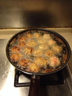 用手团好,左右手互相摔一下,帮助紧致。别买一大堆只用一两次的工具,用我们万能的手吧!至于油温,不要太低,会散,我也没有专业工具测量,经常炸东西的人都会有经验。我通常做三个尺寸的丸子,小的以后煮汤,中号的烩白菜,大号的直接蒸20分钟,什么味也不用调,就很香了。因为炸只是帮助定型,里面还是生的。