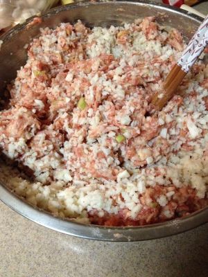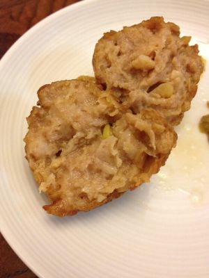 馒头切成小丁;据说讲究的做法都是自己切肉,但我通常就选一块去皮五花肉,再加一块瘦肉,让肉贩当场绞好,几分钟的事儿,算是偷懒了;花椒油是自己炸的,只要是猪肉馅做的东西我都放,去腥是极好的;葱姜切末;我不用料酒,觉得味道怪怪的,通常会在京东买十几块钱一瓶的黄酒,能用好长时间,酒味很浓;所有原材料放在一起,加盐、加糖,边撒水淀粉边顺时针搅拌,很累的,因为通常我一次炸很多,搅拌十分钟感觉有劲儿了就可以了。