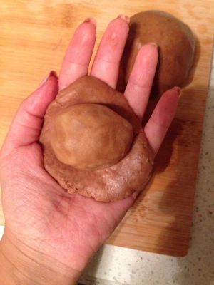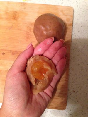 取一只蛋黄加莲蓉一起称重50g,讲蛋黄包入莲蓉陷