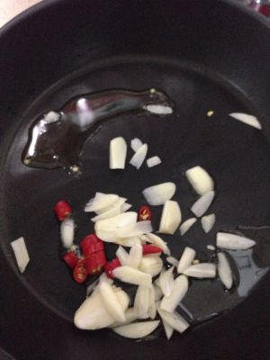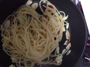 意面煮熟后,蒜片、小辣椒、橄榄油爆锅