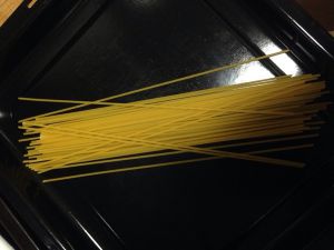 煸炒出香味后加入意面、盐,混合均匀,乘出待用。