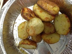先准备小土豆,因为这个需要的时间最长。小土豆洗净(不去皮),水煮至八成熟,捞起切对半,放入烤碗内,加干迷迭香,盐,鲜磨黑胡椒粒,橄榄油混合均匀,入提前预热的烤箱,180度上下火20分钟,200度5分钟(带皮的一面褶皱,另一面焦黄就OK了)