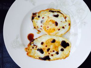 记得翻面,煎到两面金黄盛出装盘。怕蛋黄不熟可以多煎会,别焦掉。