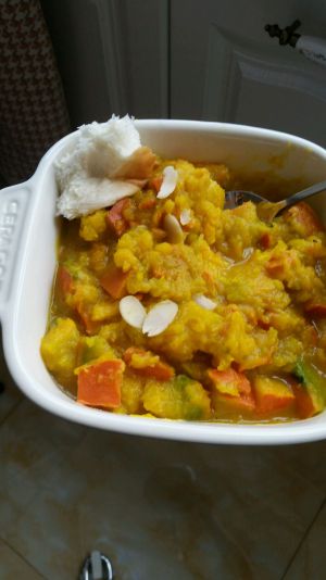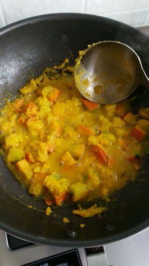 改小火 用勺子把南瓜压烂一部分 这样味道会浓一些 口感也不错 这个时候汤会变少 所以务必小火