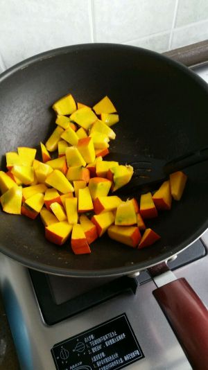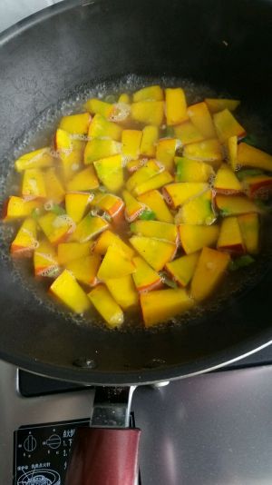 放入少量水 刚刚没过南瓜就可以 盖上锅盖闷15分钟 中火
