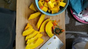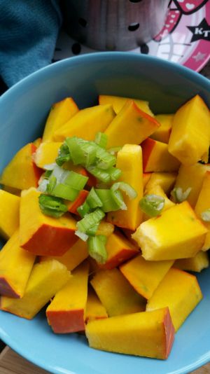 三四滴橄榄油 南瓜和葱花放入锅中炒 闻到葱花香味放一丁点盐