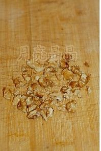 油炸好的大核桃仁,用厨房纸吸去表面油份,用刀背压碎。