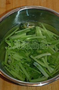 把芹菜段捞出用清水冲凉,沥干泡在冰水(凉开水加冰)中。
