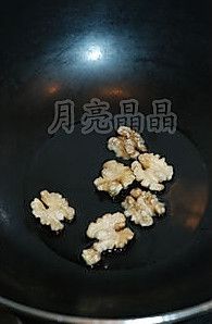 冷锅冷油放入剥好的核桃仁,开小火,慢慢炸至表面金黄。
