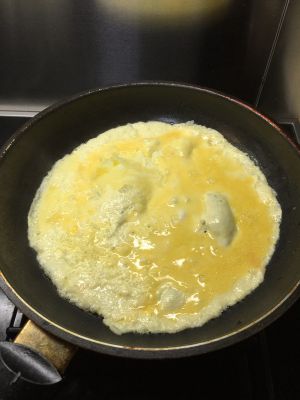 鸡蛋薄饼摊凉后,用勺将肉碎摊平到鸡蛋饼上。