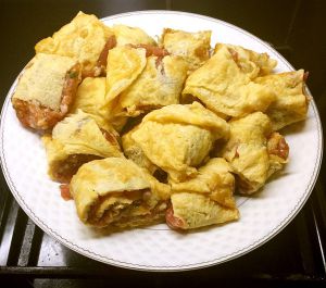 将蛋饼像卷毛巾方式,卷成蛋筒状,再用刀切成一小段一小段摆盘。