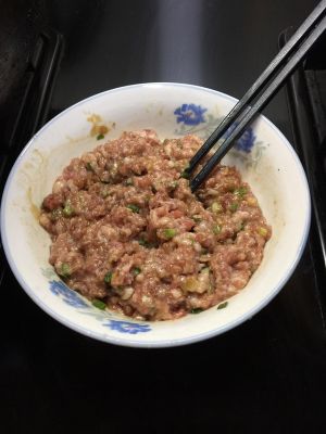 前腿肉剁碎,放入盐、鸡精、蚝油、葱花、姜末末、胡椒碎,搅拌均匀备用。