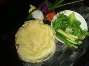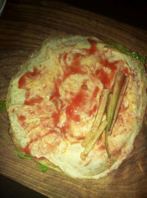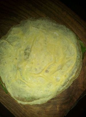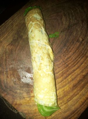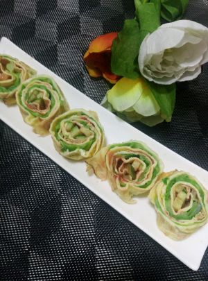 鸡蛋打开摊成蛋皮两张,叶子用开水焯下过凉水,黄瓜切条