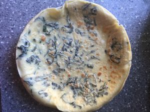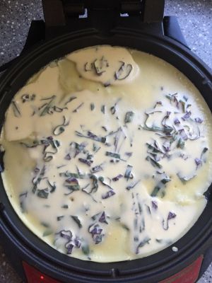 1分钟左右,待面糊变色凝固,翻面。再烙半分钟。