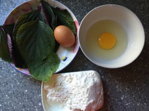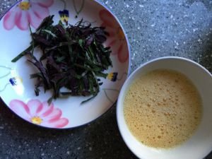 紫苏叶切碎,鸡蛋打成蛋液。