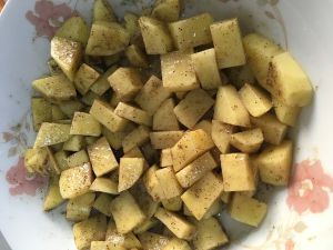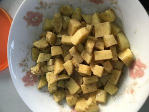 加入盐,黑胡椒粉,孜然粉,油,均匀搅拌,腌制半个小时(土豆的外层因为有油所以不会氧化)