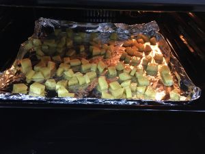 均匀码在烤盘里,汁水都倒在锡纸上。烤箱温度180,烤15分钟即可,若15分钟后感觉土豆太爽脆可以再加烤3分钟。