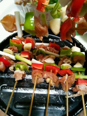 按照一块肉彩椒,一块肉葱蒜,顺序,也可以自己串