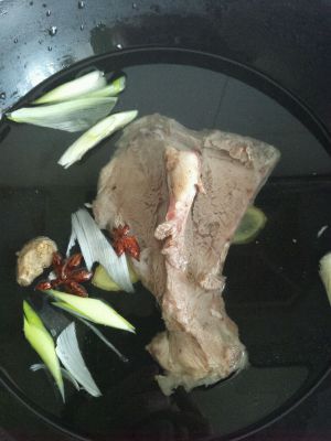 如图中所示,焯水过后把骨棒下锅,倒入开水