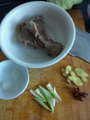 大骨棒先焯水,注意焯水时不要盖锅盖,向锅中放几片生姜,焯的时候要冷水时就让大骨棒下锅