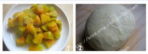 将南瓜块覆膜(保鲜膜上扎两小孔)放入微波炉,中高火“叮”8-10分钟至熟软,取出沥干水,放入盆中乘热捣碎。捣碎的南瓜泥稍微放凉,加入糯米粉搓揉成面团。注意,糯米粉不要一次加完,不同的南瓜含水份会有不同,留出小部分糯米粉以便最后调节面团的干湿度。