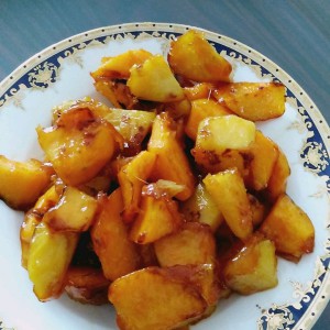 关火将炸好备用的红薯倒入均匀翻炒,出锅