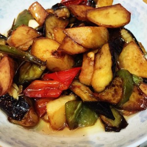 另起锅倒少许油,葱姜蒜爆香,倒入茄子土豆青红椒翻炒两下,倒入调好的料汁,翻炒两下,放点蒜末翻炒,出锅,上桌!
