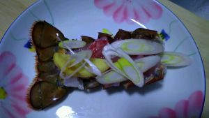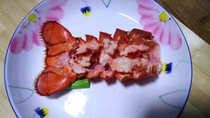 龙虾去头,虾肚子剪开露出虾肉,虾钳用刀背敲碎取出虾肉放在虾壳上放上葱姜片,滴少许料酒(剩余虾头不要浪费,可以煲汤喝哦!)