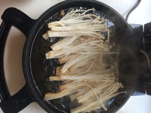 五花肉煎熟后用剩下的油煎金针菇,五花肉煎成什么样根据自己的喜好,我比较怕油,所以煎的很脆