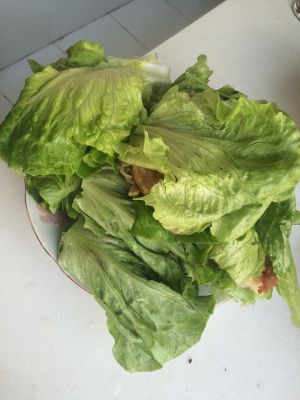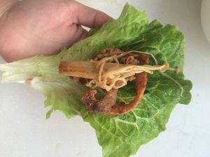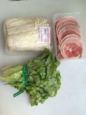 生菜洗净,用开水烫一下,放上五花肉和金针菇包起来。生菜用开水烫一下会软点,比较好包