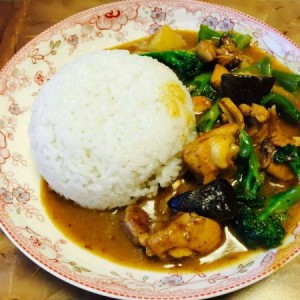 接下来锅里热油,准备炒鸡。将鸡块儿炒至变色后加入土豆、香菇、西兰花一起炒,可以稍微加一点味达美调味,然后锅里加入水,放入咖喱块儿,炖一下。这里用的是好侍百梦多咖喱,在超市就可以买到。蔬菜和鸡肉快熟好的时候放入青椒,这样青椒会比较脆,不会煮软。锅内汤汁浓稠之后即可关火。过程中可以依据个人的口味加盐或糖调味。