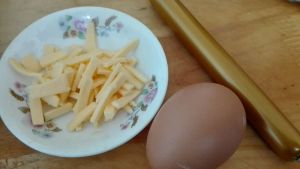 准备好芝士,火腿肠,鸡蛋,甘蓝丝,根据自己的口味加胡萝卜丁和喜欢的蔬菜也行,但少量因为主要不是蔬菜。