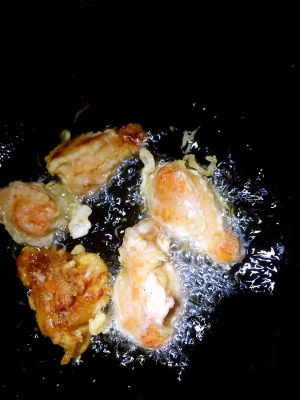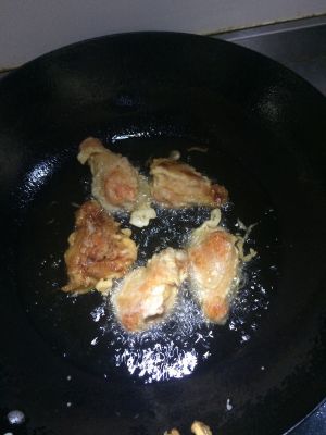 腌一个小时左右的翅根挂糊下油锅炸,中火五成热油下锅炸制变色,期间怕炸不熟可用筷子戳几下