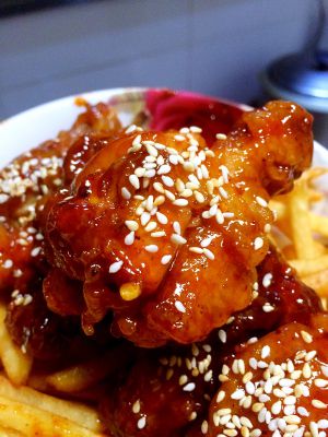做酱忘记拍了,亨氏番茄辣椒酱用小火炒热,加一勺糖,一点点的生抽搅匀,倒入炸好的鸡翅根开始翻炒裹讲
