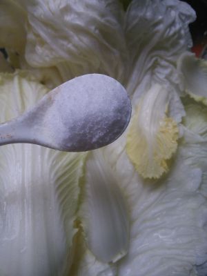 开始撒盐,一边撒盐一边揉搓,让白菜里面的水分尽快出来