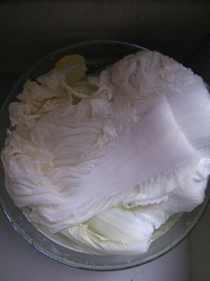 大白菜一个洗净,小心地一片一片把菜叶子掰下来