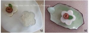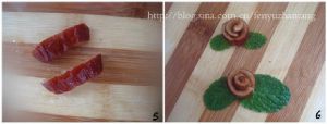 再切成两半,用剪刀修整。将红枣卷曲,整成花型。