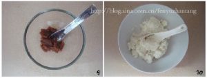 将蒸好的红枣去皮取肉,用勺子压成红枣泥。再将蒸好的山药用勺子压成泥。