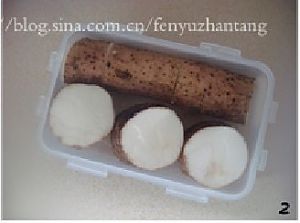 将山药表皮的泥洗净,然后切成段放在热水里,净泡30分钟。(这方法山药去皮的时候不会手痒)
