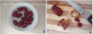 红枣用清水冲洗净表面的灰尘,放到热水里泡5分钟。红枣切去两头,去核。