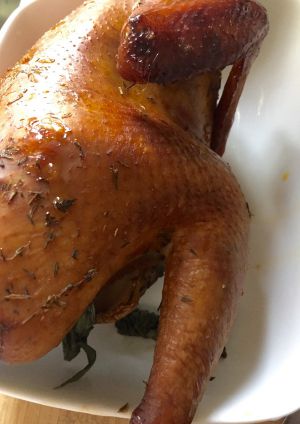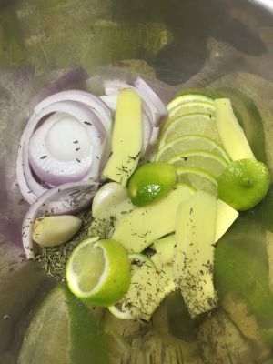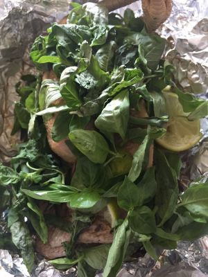 准备另外一个青柠切片,和罗勒叶一起铺在腌制好的鸡身上,用锡纸包好,入烤箱200度20分钟,取出去掉包在外面的锡纸入烤箱的烤架上继续烤30分钟,如果怕表皮烤焦可以在上面铺上一张锡纸